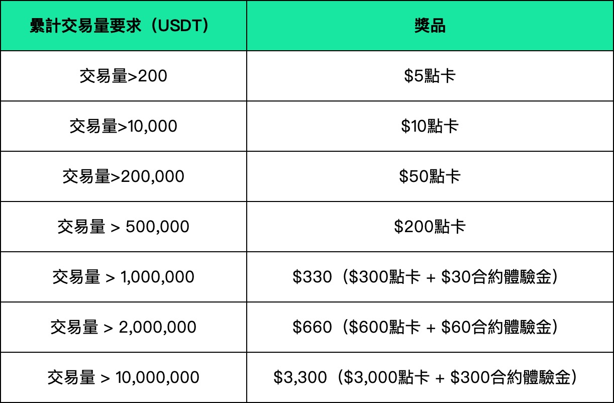 活動期間,新註冊用戶或現貨用戶(賬戶權益不低於10USDT)進行首次合約交易,纍計交易量達到要求,用戶最高獲得$3,300獎勵,獎池金額一共$60,000,先到先得!