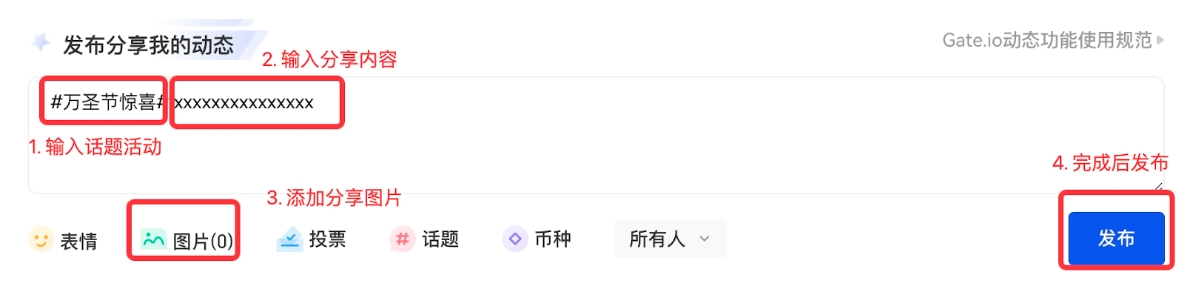 活动期间,官方在动态圈、聊天室、博文处随机发布带有数字1-9的南瓜灯图片,参与用户收集到连号的5个数字后,带话题 #Gate南瓜灯# 发布相关图片至动态圈即可参与万圣节福利活动。活动结束后【VIP点赞人气】累计总分高于10分且排名前10的用户,每人可获对应代币奖励。