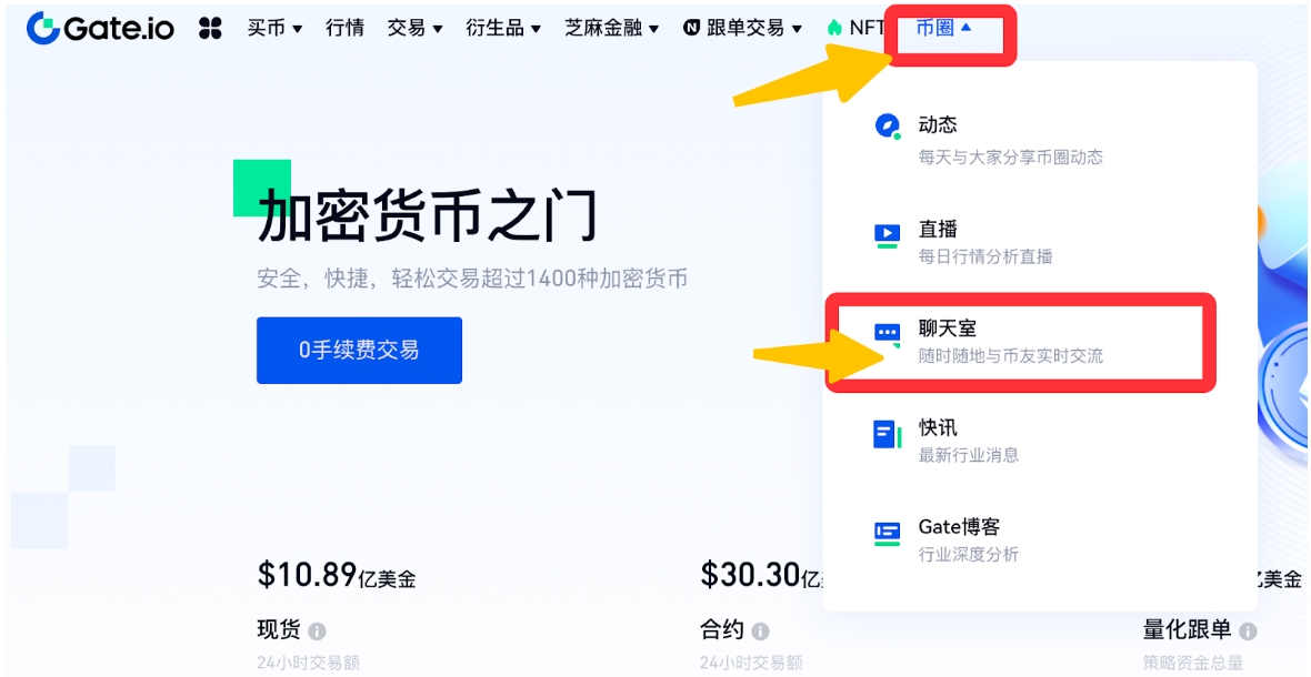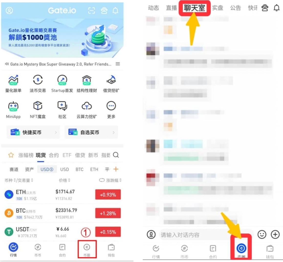 手机App:点击右下角【币圈】按钮,点击“聊天室”即可进入。