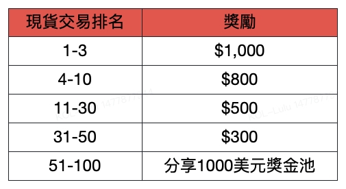 - 在現貨交易中累積至少1000美元;符合條件的用戶將平等分享5000美元等值的代幣獎池。