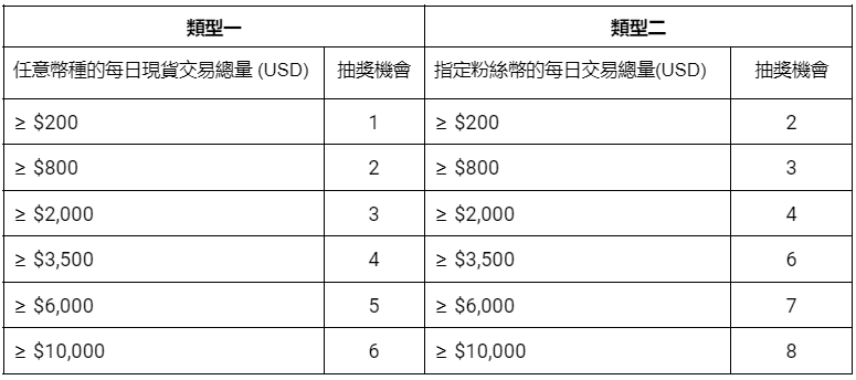 1) 兩種類型的抽獎機會不可同時獲得,以較高交易量為準,獲得抽獎次數。