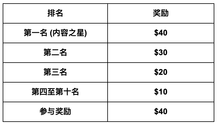 参与奖:在每个自然周内发帖数量不少于1条用户,有机会获得幸运参与奖;每周选出10名幸运用户,每人$4等值代币奖励。