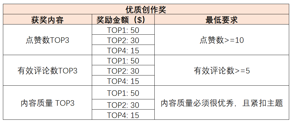 内容质量TOP3:对于发布优秀内容但尚未被其他用户发现的,平台将根据内容本身质量进行评选