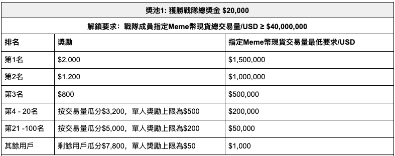根據每個戰隊所有成員累積的meme幣現貨交易總量進行PK,獲勝戰隊即可解鎖高達$20,000總獎池,獲勝戰隊的成員按照本人meme幣現貨交易量排名瓜分解鎖的總獎池。
