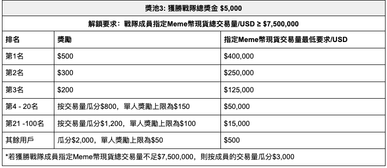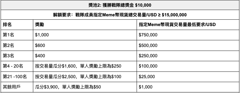 3. 獎池解鎖規則:戰隊成員完成本隊指定的meme幣現貨交易才能被計入在內