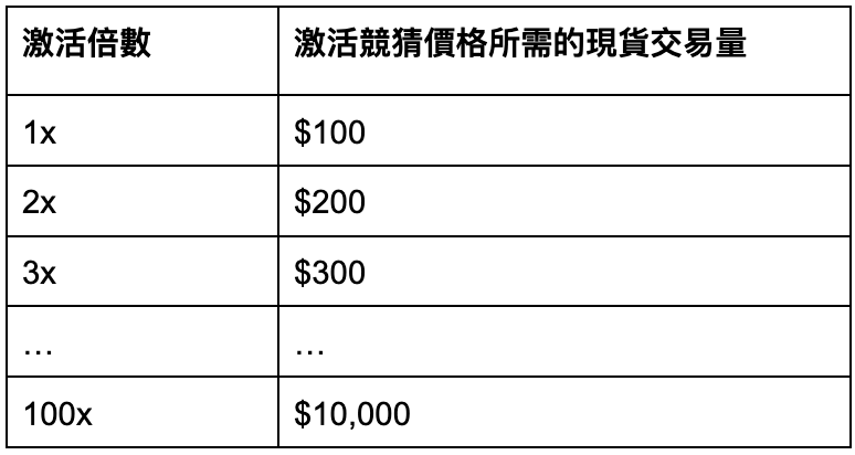 1.激活競猜價格:在當日收盤時間(23:59, UTC)前完成相應現貨交易,競猜價格的激活順序按照用戶提交競猜價格的時間先後依次進行激活。