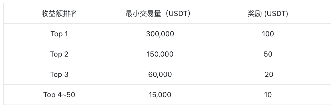 单个参赛订单投入金额 ≧ 100USDT,