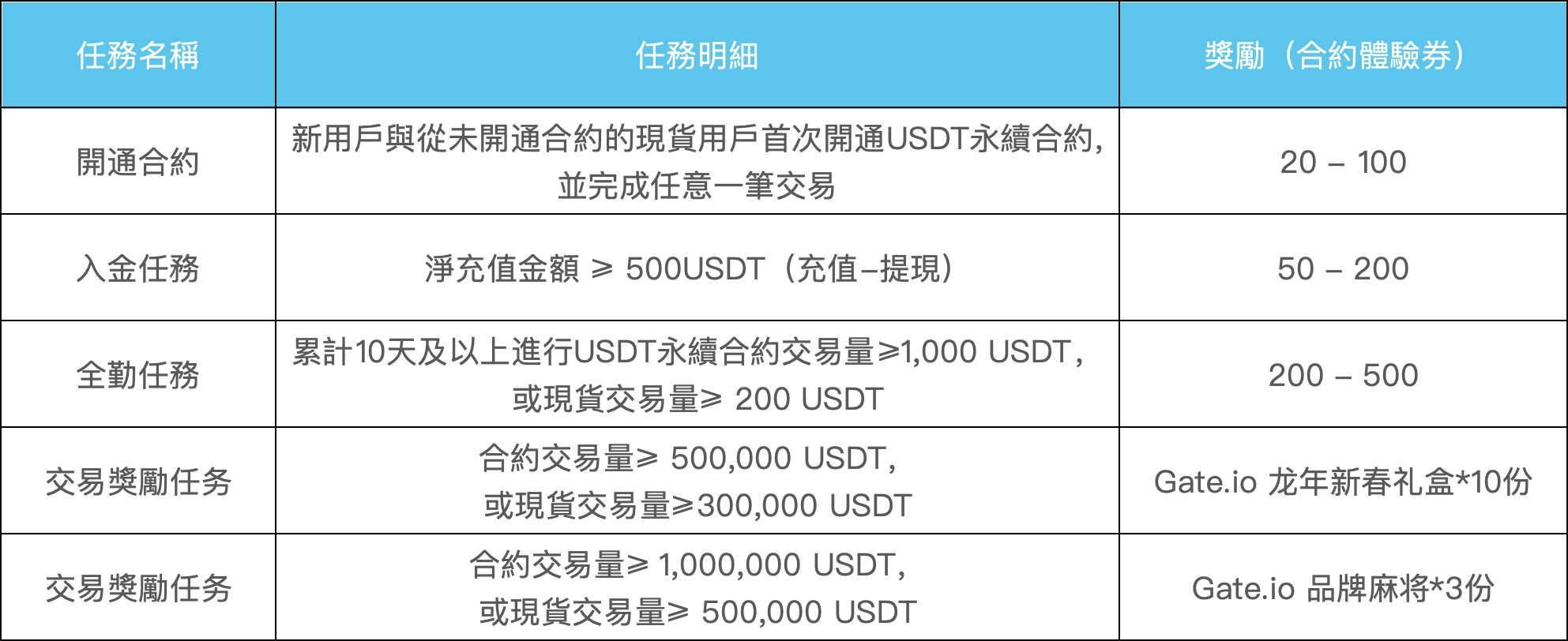 活動期間,新老用戶完成指定任務即可獲得對應獎勵,完成任務越多,可獲得獎勵越多!總獎池 20,000 USDT合約體驗券,領完即止!另有Gate 品牌麻將、Gate 龍年新春禮盒相送!獎勵詳情如下: