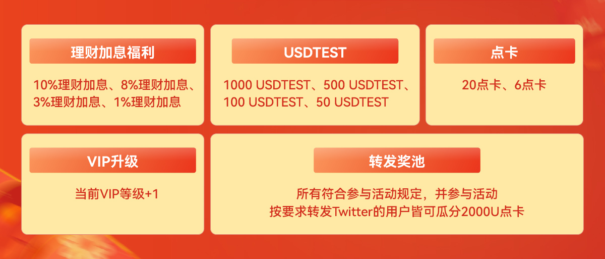 4.奖励以点卡、USDTEST、VIP形式发放,点卡有效期15天、USDTEST有效期7天、VIP+1有效期7天。