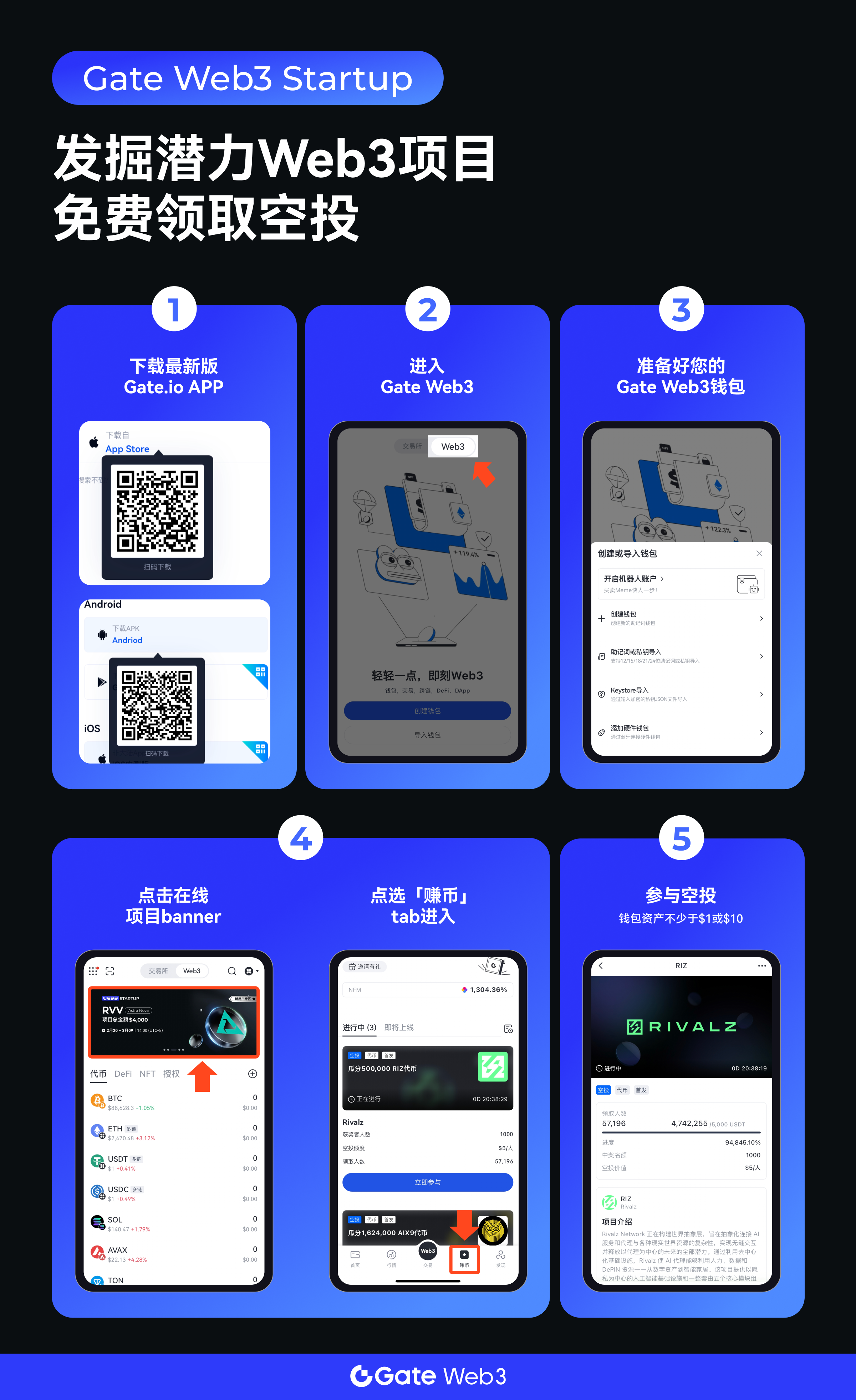 为回馈平台用户,Gate 于2023 年7月3日正式上线“Gate Web3 Startup”,不定期进行区块链项目的空投计划,Gate Web3的钱包用户可以通过参与Web3 Startup,获得代币、NFT、白名单空投福利。