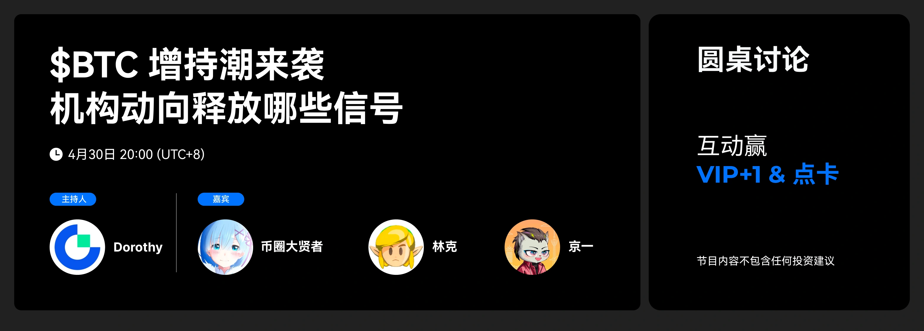 GateLive将于4月30日20:00(UTC+8)举办直播栏目《圆桌讨论》。我们将邀请三位区块链研究员,共同探讨$BTC 增持潮,释放哪些信号以及投资者应对策略。观看直播,直播间免费领空投: