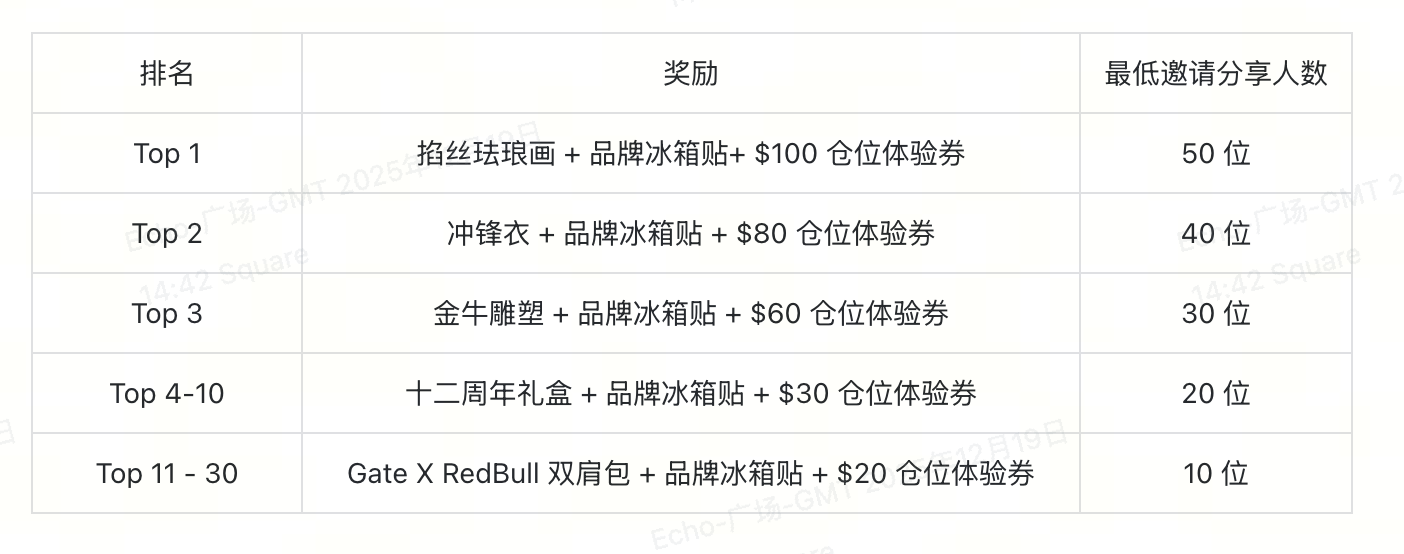 - 仓位体验券奖励将会在活动结束后的 30 个工作日内完成发放,请及时查收您的账户。周边和实物奖励将在活动结束后 60 日内,审核符合发奖条件后会自动完成空投发放,请注意留意您的物流信息;若因物流原因导致奖励无法送达,周边奖励将以等值仓位体验券形式发放,其中掐丝珐琅画以 $500 仓位体验券,冲锋衣以 $400 仓位体验券,金牛雕塑以 $300 仓位体验券,十二周年礼盒以 $200 仓位体验券,Gate X RedBull 双肩包以 $100 仓位体验券,Gate品牌冰箱贴以 $50 仓位体验券,Gate 鸭舌帽、托特包、开瓶器以 $30 仓位体验券发放。