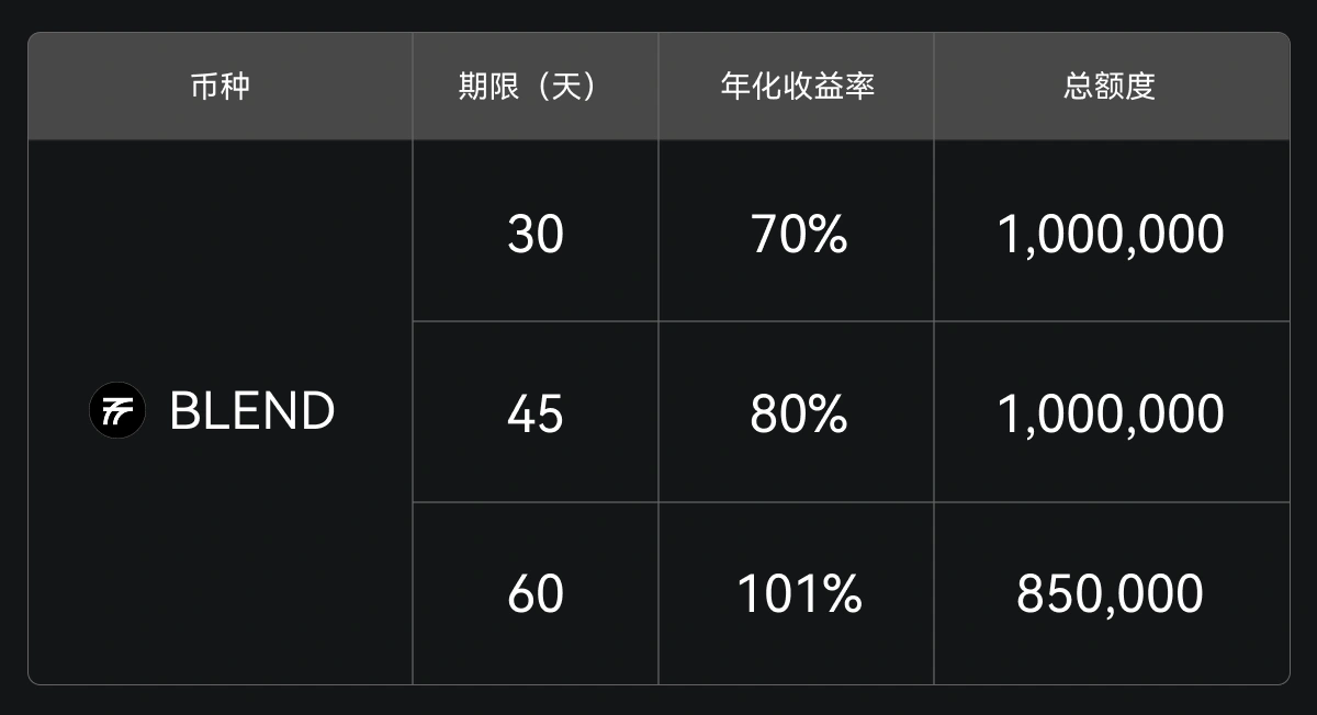 Gate 余币宝现已上线 BLEND 定期理财,提供 30 天、45 天、60 天三种锁仓周期,年化收益率最高可达 101%,最低仅需 10 BLEND 起投,欢迎前往参与申购。