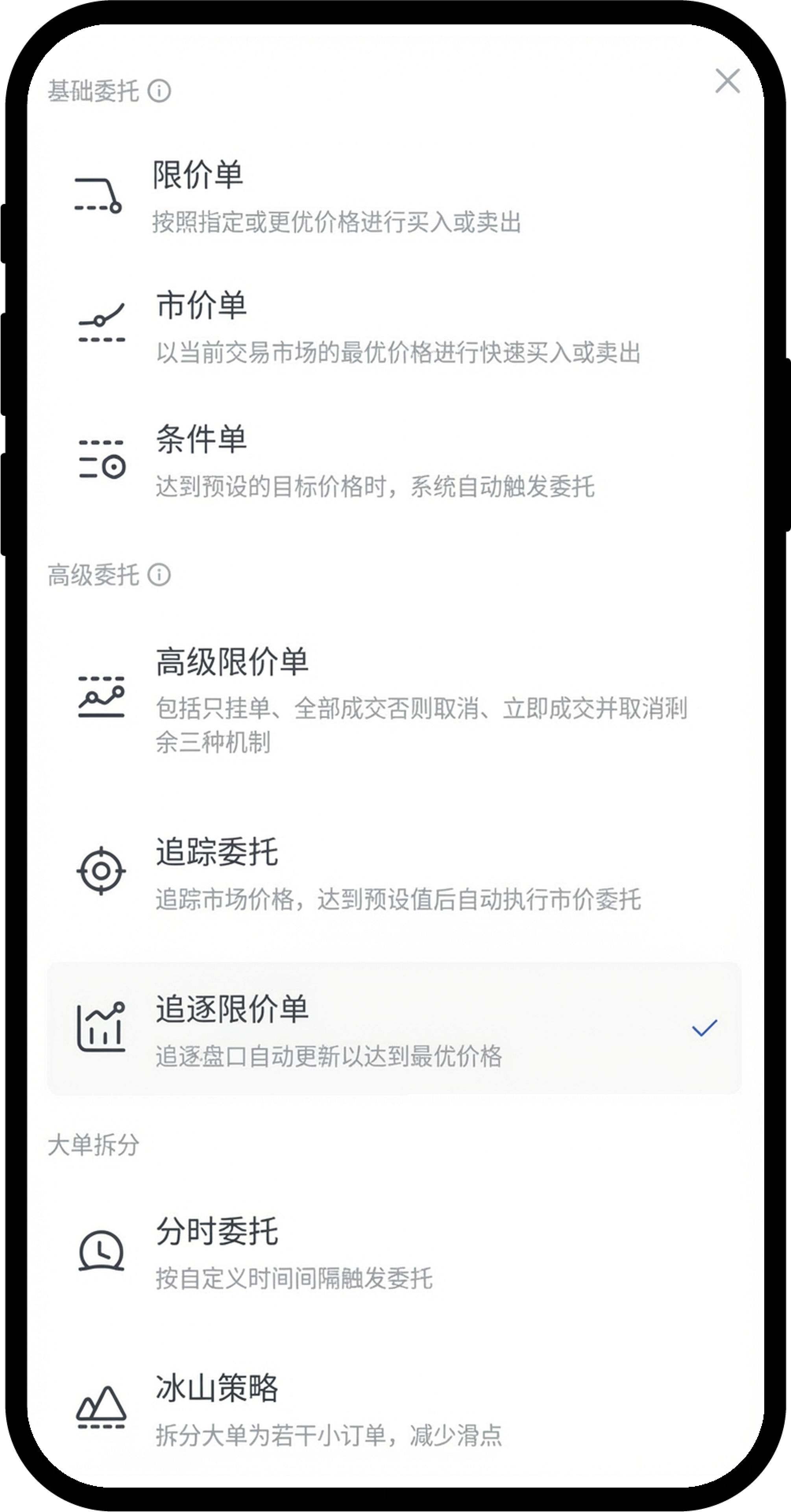追逐限价单是一种以最优买价或卖价下达的限价单,会根据不断变化的市场行情动态调整入场价格,直至订单成交、取消或达到最大追逐距离。