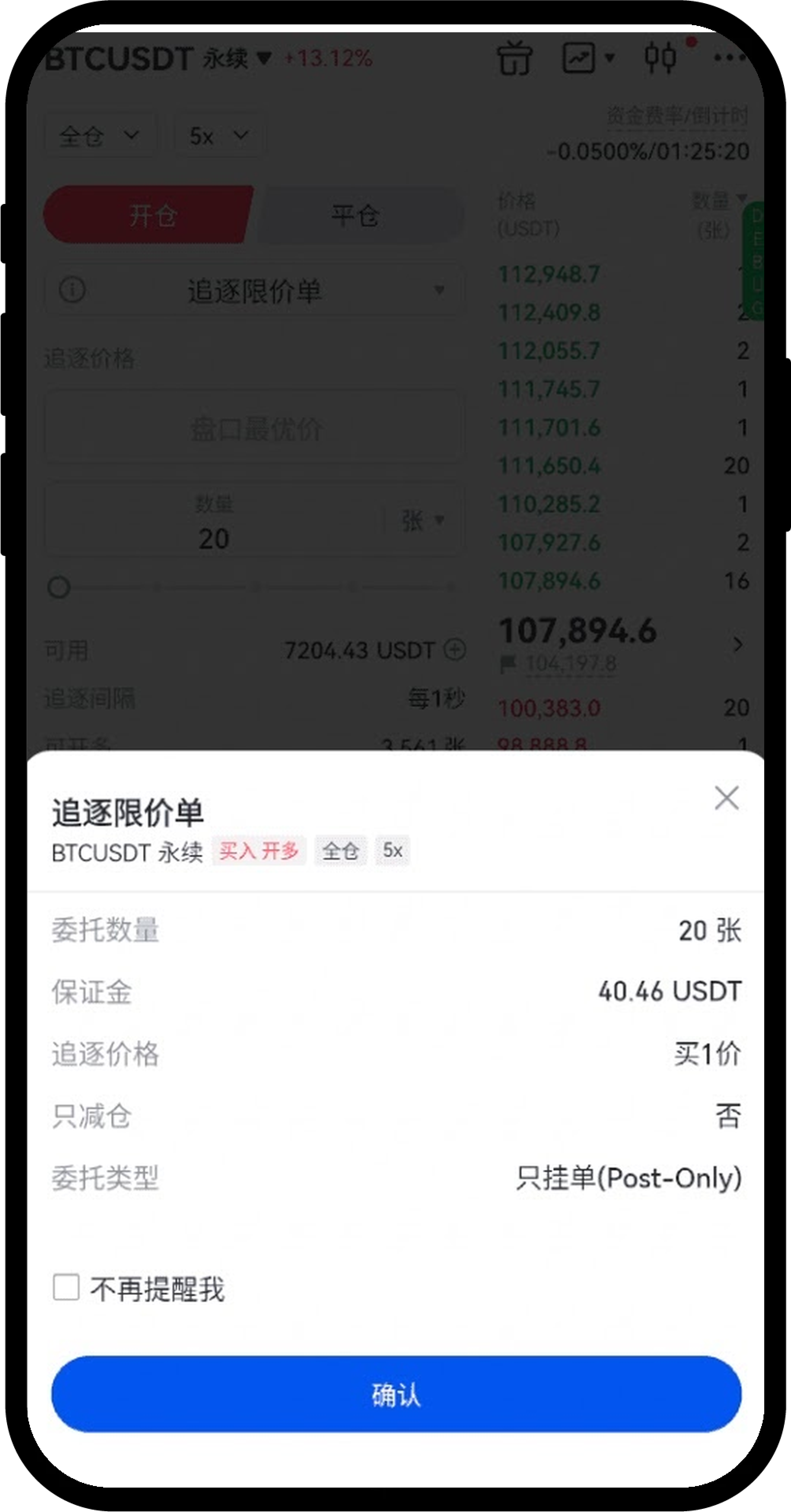 追逐限价单适用于所有永续合约交易(包括USDT本位和BTC本位)。提交追逐限价单后系统会按照当前方向盘口一价即时更新委托价格,使得订单较快成交的同时还能节省手续费,我们来举例说明。