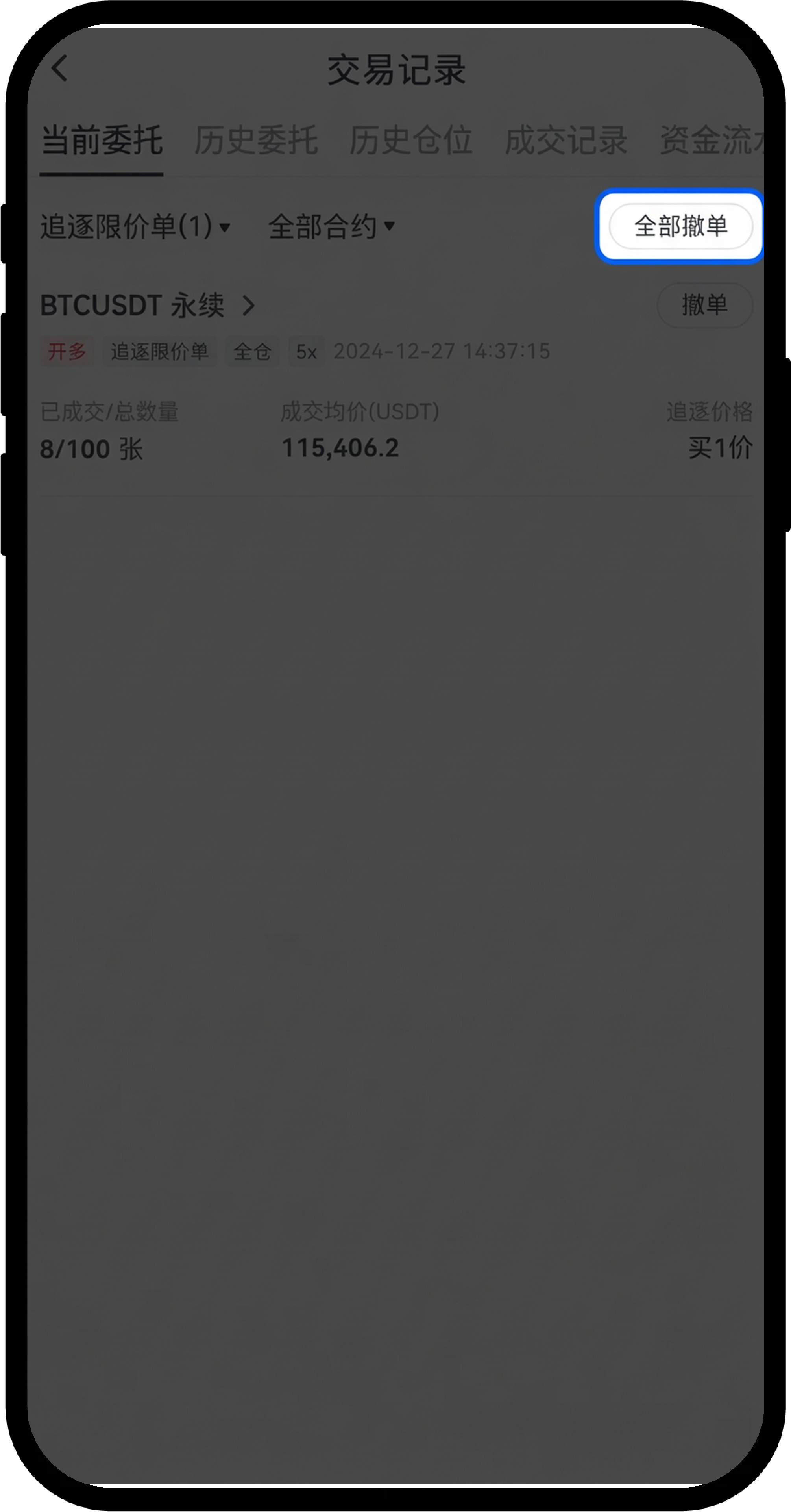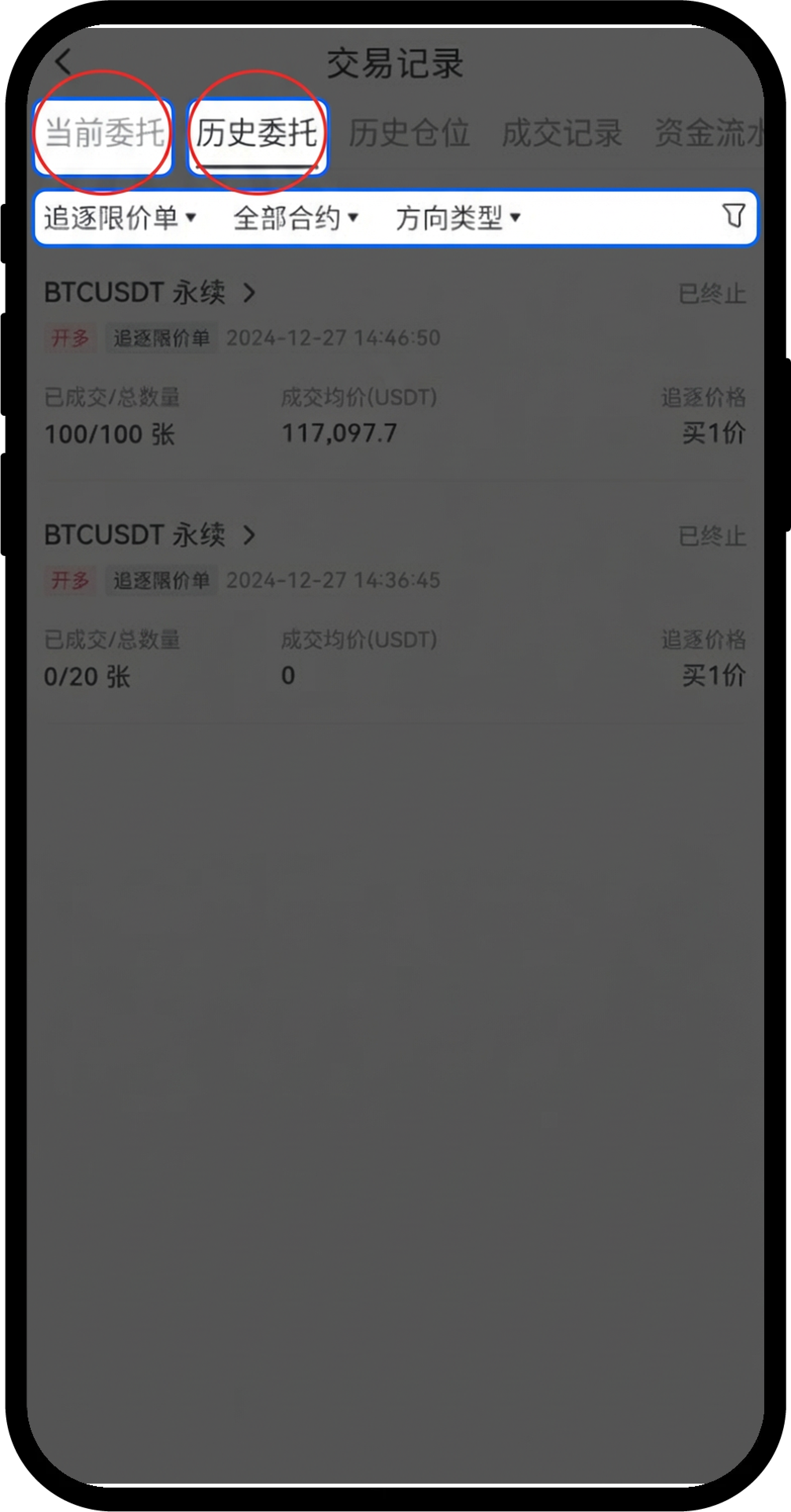 已完成或已撤销的追逐限价单都会进入【历史委托】中,可点击交易页面下方“仓位”最右侧的“账单”图标,可以查看历史委托记录。下图为追逐限价单历史委托信息: