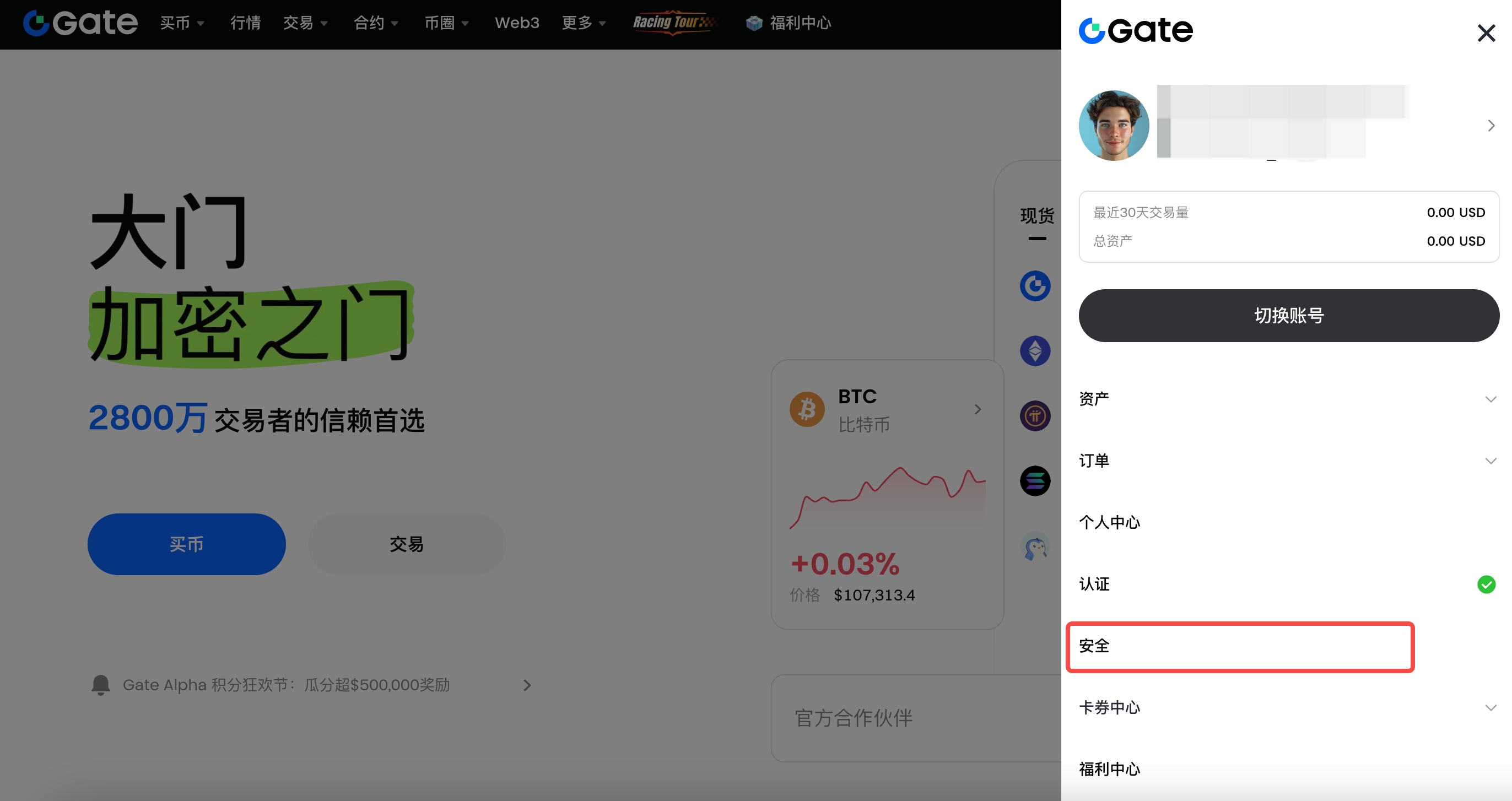 1、打开Gate手机App,登录个人账户——首页点击左上角“头像”,点击头像右侧的右箭头标识,点击“安全中心”——“邮箱”。