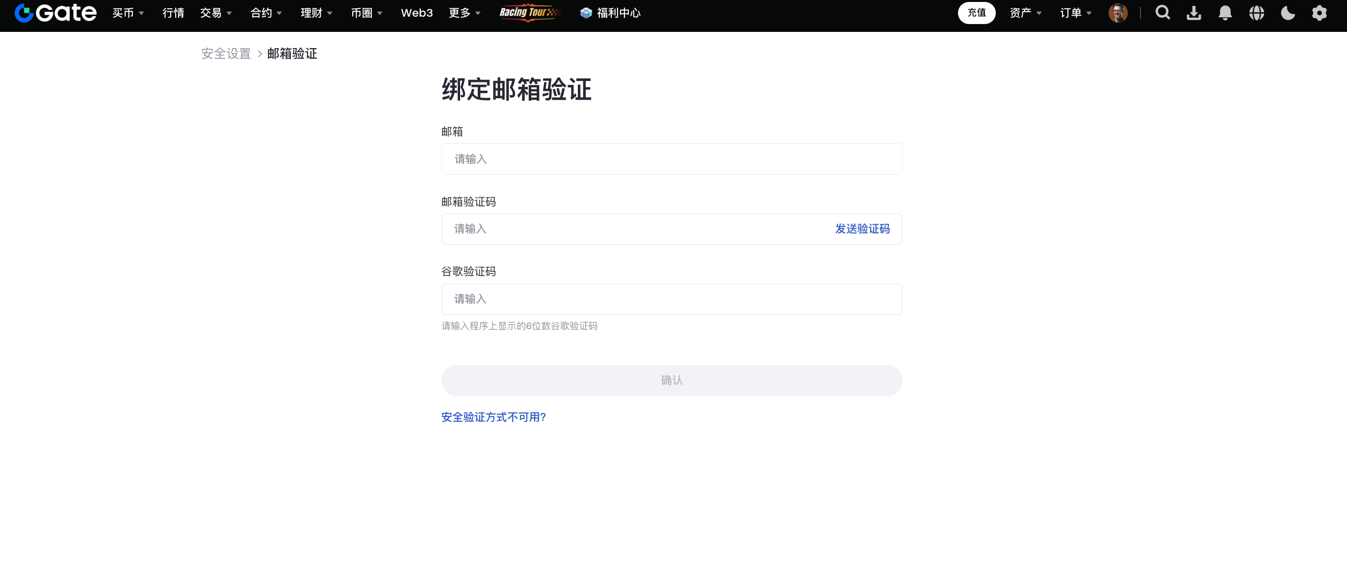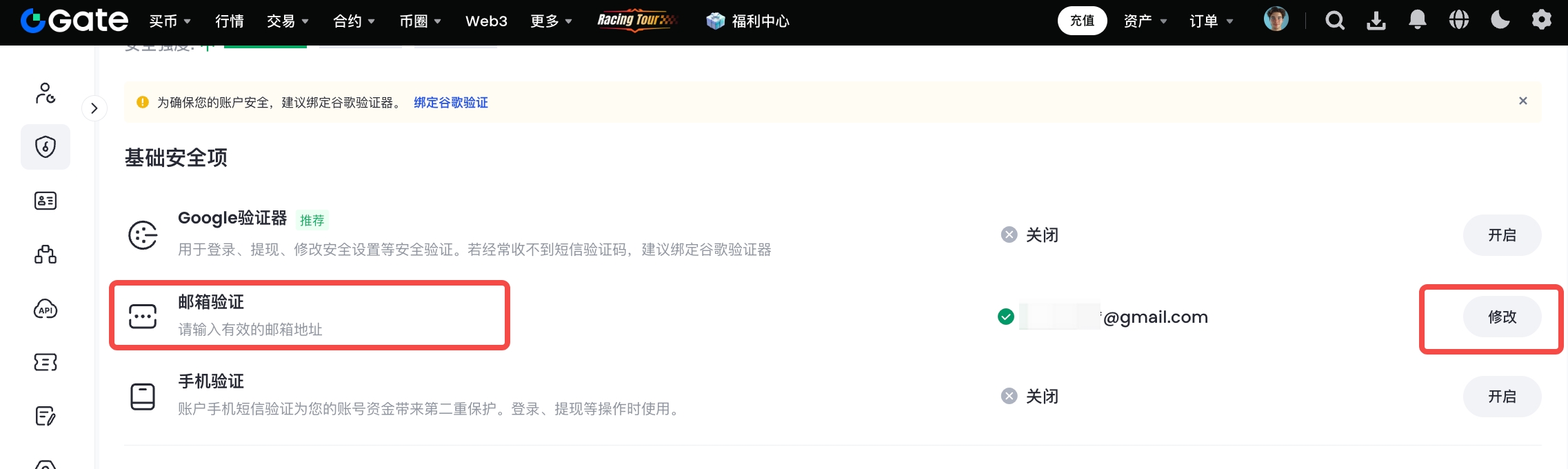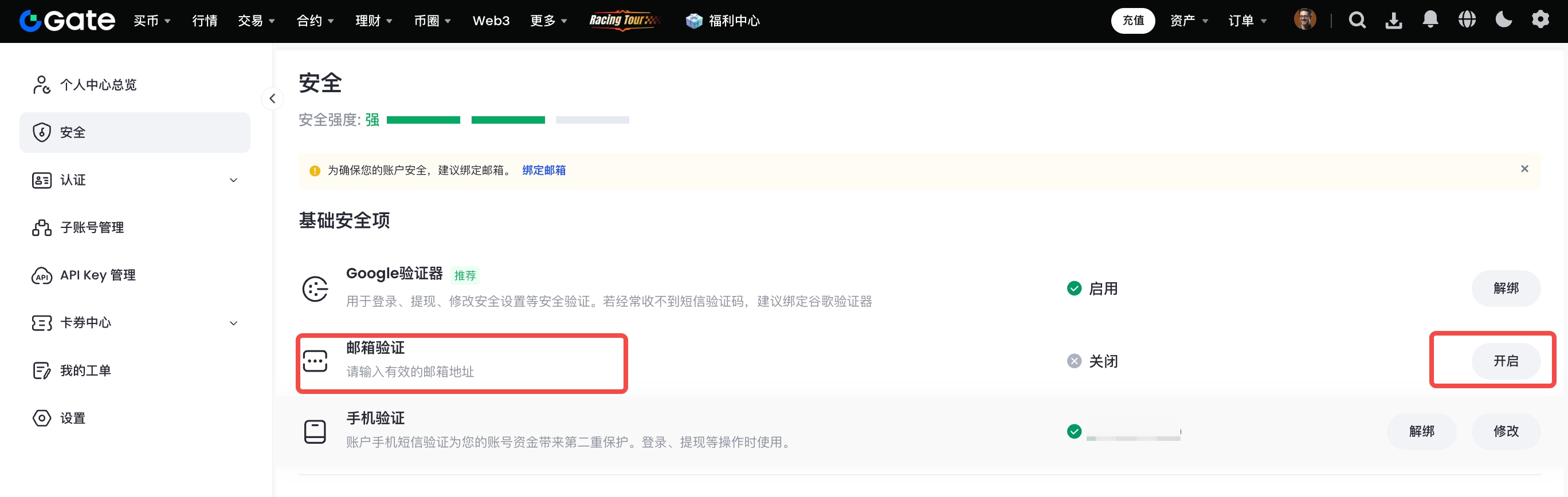 1、登录Gate个人账户,点击右上角“头像”——“安全设置”,在“基础安全项”中找到“邮箱验证”点击“开启”进入邮箱绑定界面。
