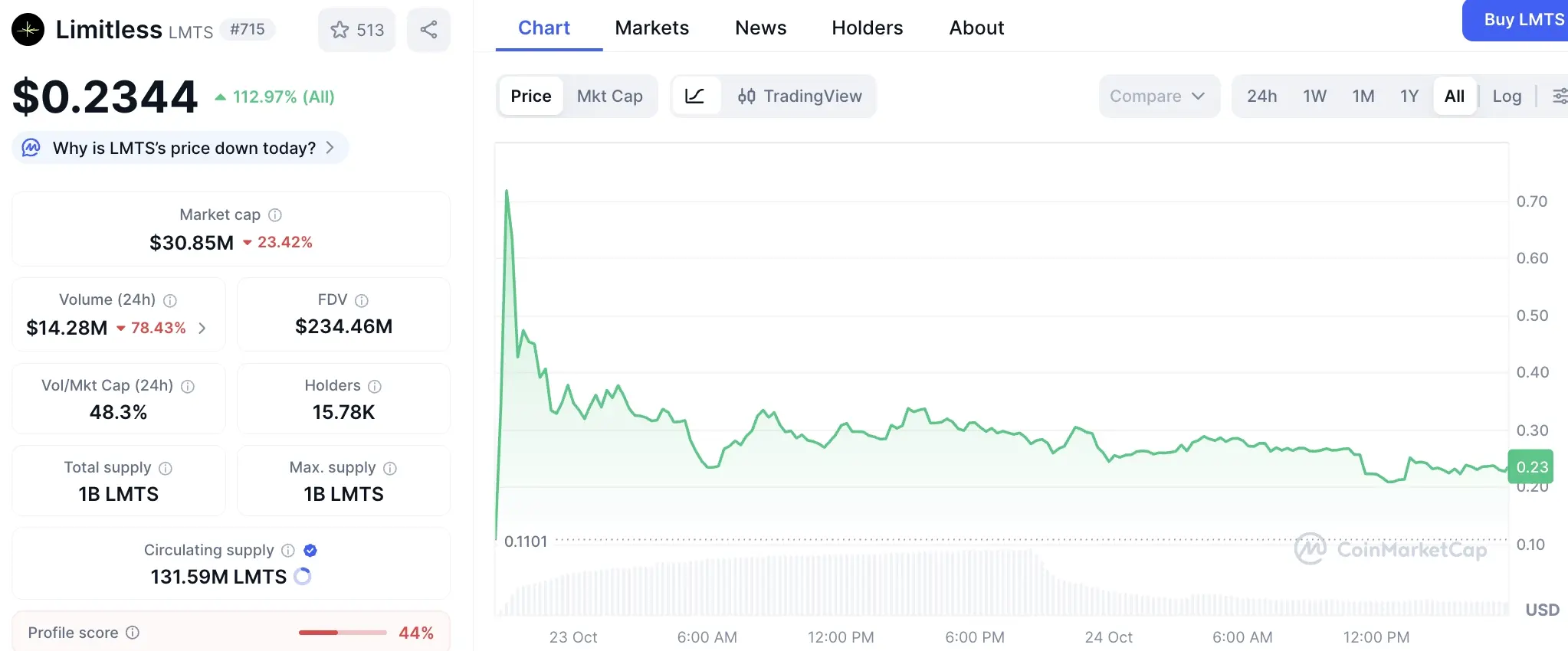 根据 CoinMarketCap 数据,LMTS 在上线初期一度冲高,但随后迅速下跌超过 60%,流动性骤降。社区信心在短时间内崩溃,KOL 与用户在社交平台上争论不休。部分投资者认为,团队以“防狙击”为名操作大量资金,实质上模糊了内部行为的边界;而另一些人则指出,项目方的公关节奏与信息披露过于滞后,让市场恐慌情绪持续放大。