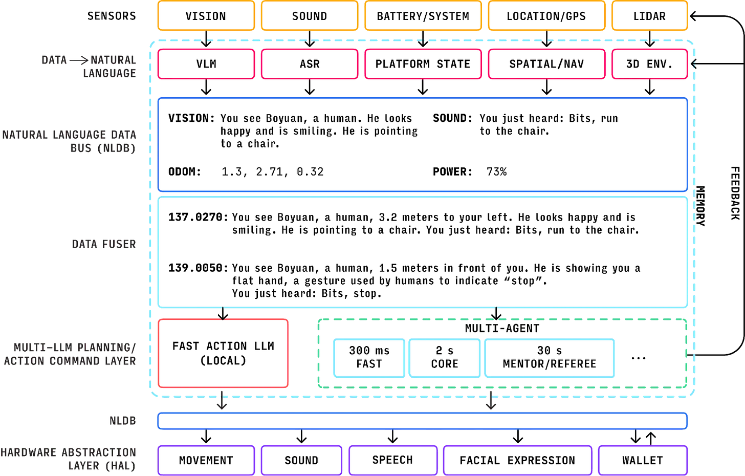 首先,机器人从摄像头和麦克风等各种传感器模块收集环境信息。这些数据以二进制格式输入,但多模态识别模型将其转换为自然语言。VLM(视觉语言模型)处理视觉信息。ASR(自动语音识别)处理音频。这会生成诸如"一个男人指着前面的椅子"和"用户说’去椅子那里’"这样的句子。