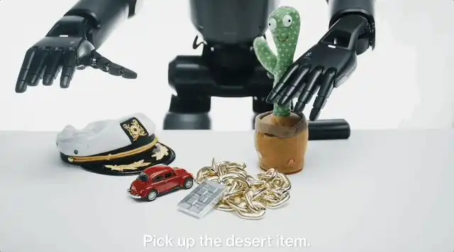 让我们看一个具体例子。机器人面前放着多个物体。有人要求"拿起一个与沙漠相关的物品"。传统机器人会失败,因为"沙漠物品"不存在于预定义规则中。OM1不同。它通过LLM理解概念关系。它独立推断出"沙漠"和"仙人掌"之间的联系。它选择了仙人掌玩偶。OM1为机器人协作奠定了基础,并使单个机器人更加智能。