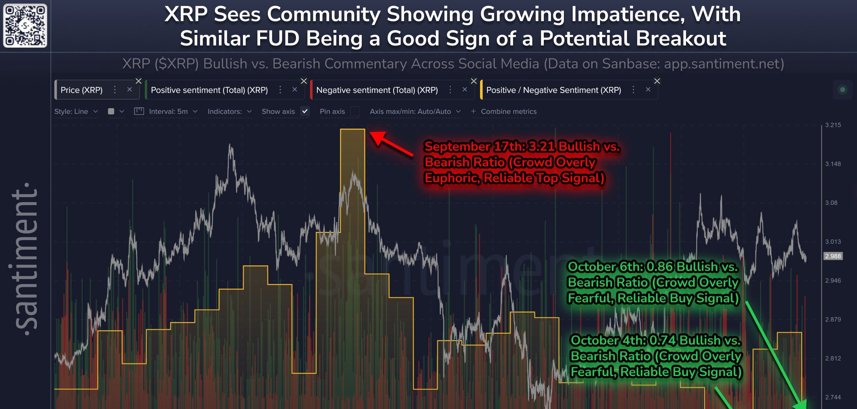 相反,高度积极情绪的时期被视为一个理想的出售时机。例如,在9月17日,积极提及的次数比消极提及高出3.21倍。在随后的八天里,XRP的价格下跌了约14.1%。