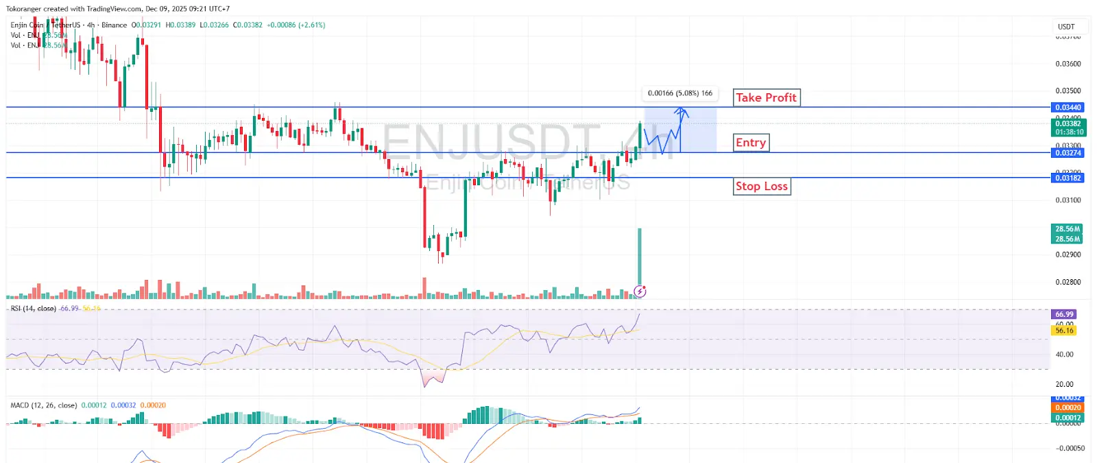 ENJ/USDT在强烈需求区$0.03180-$0.03270$反弹健康,伴随高量的冲击蜡烛,显示买盘逐渐入场。如果价格能保持在入场区上方,继续向阻力位$0.03440攀升的可能性很大,RSI也已从中性区域回升,显示看涨动能开始恢复。MACD开始形成正向曲线,增强短期上涨趋势的潜力。