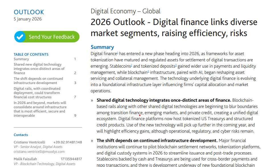 来源:CryptoNewsNet原文标题:稳定币成为穆迪2026年展望中的核心市场基础设施原文链接: 根据穆迪发布的一份跨行业展望报告,稳定币正从一种加密原生工具转变为机构市场基础设施的核心部分。在报告中,评级机构表示,2025年稳定币的结算量比前一年增长了约87%,根据行业估算的链上交易活动,达到$9 万亿的规模,而非纯粹的银行间流动。穆迪表示,法币支持的稳定币和代币化存款正逐步演变为“数字现金”,用于流动性管理、抵押品转移和跨越来越多代币化的金融系统中的结算。## 稳定币接入机构轨道穆迪将稳定币与代币化债券、基金和信贷产品一同列为传统金融与数字金融融合的更广泛趋势的一部分。银行、资产管理公司和市场基础设施提供商在2025年进行了区块链结算网络、代币化平台和数字托管的试点,旨在简化发行、后交易流程和盘中流动性管理。报告估算,到2030年,这些项目的投资总额可能超过$300 十亿,用于构建大规模代币化和可编程结算的轨道。在这一背景下,稳定币和代币化存款越来越多地作为跨境支付、回购(短期有担保贷款(其中一方出售证券并同意在稍后以更高价格回购)以及抵押品转移的结算资产。穆迪指出,2025年,受监管机构使用现金和美国国债支持的稳定币,促进了基金、信贷池和交易场所之间的盘中流动,试点项目包括花旗集团和法兴银行等。JPM Coin被引用为一种存款代币模型,集成了可编程支付和流动性管理,展示了“数字现金”层可以在传统核心系统之上运行的方式。## “数字现金”的监管与风险监管开始跟上这一转变。报告强调了欧盟的《加密资产市场法规》()MiCA()框架、美国的稳定币和市场结构提案,以及新加坡、香港和阿联酋的许可框架,作为全球在代币化、托管和赎回规则方面趋同的证据。在欧洲,法兴银行-Forge的EURCV及相关项目被视为在欧盟新兴稳定币框架下开发的银行发行产品的例子,而在海湾地区,银行和监管机构正在探索阿联酋迪拉姆挂钩的支付代币和更广泛的数字货币架构。然而,穆迪强调,这一转型远非没有风险。随着更多价值转入“数字轨道”,报告警告智能合约漏洞、预言机故障、托管系统的网络攻击以及跨多个区块链的碎片化可能带来新的操作风险和对手风险。该机构认为,安全性、互操作性和治理将与监管明确性同样重要,如果稳定币要作为可靠的机构结算资产,而非系统性脆弱性的新增源。